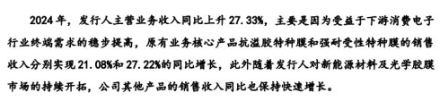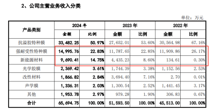 最新招股书显示,2024年度,新广益营收突然大幅增长至6.57亿元、净利润增至1.16亿元。主要原因是其占比较低的两项业务:强耐受性特种膜、新能源材料,收入突然快速增长所致,具体披露如下: