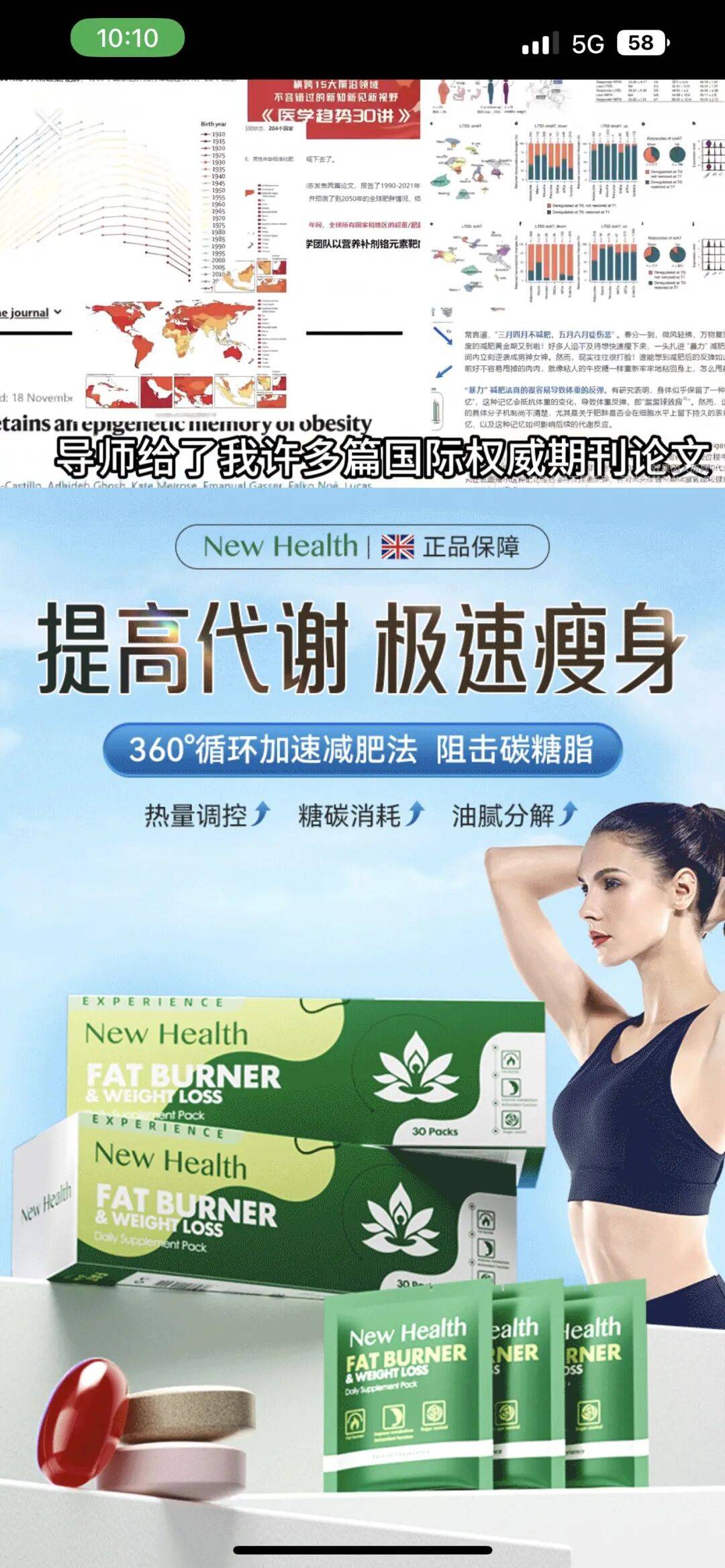 “研二实习跟手术时,亲眼看到胖人肚子里的脂肪像油一样溢出来,165斤的我彻底破防了。”在某社交平台,一名账号为“卡路里刺客”的博主,以“既卷学术也卷身材的六边形战士”为标签发布视频,力荐NewHealth新海思多维代谢每日补充包。