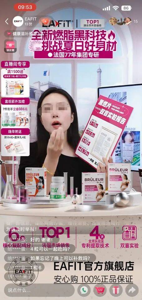 同为热销跨境减肥产品,法国品牌EAFIT黑燃片则通过直播间“场景化营销”撬动销量。在某社交平台的EAFIT海外旗舰店直播间,每天早中晚时段,主播都会拿着产品和“成分表展板”,重复着颇具煽动性的宣传。