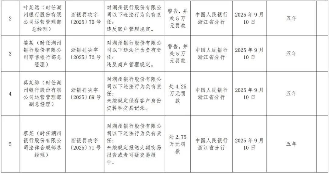 一同被罚的还有湖州银行4名时任中层管理人员。该行时任运营管理部总经理叶某远因对该行违反账户管理规定负有责任,被警告并处5万元罚款;时任零售银行部总经理姜某因对该行违反商户管理规定负有责任,被警告并处5万元罚款;时任运营管理部副总经理莫某绯因对该行未按规定保存客户身份资料和交易记录负有责任,被处4.25万元罚款;时任法律合规部总经理蔡某因对该行未按规定报送大额交易报告或者可疑交易报告负有责任,被处2.75万元罚款。