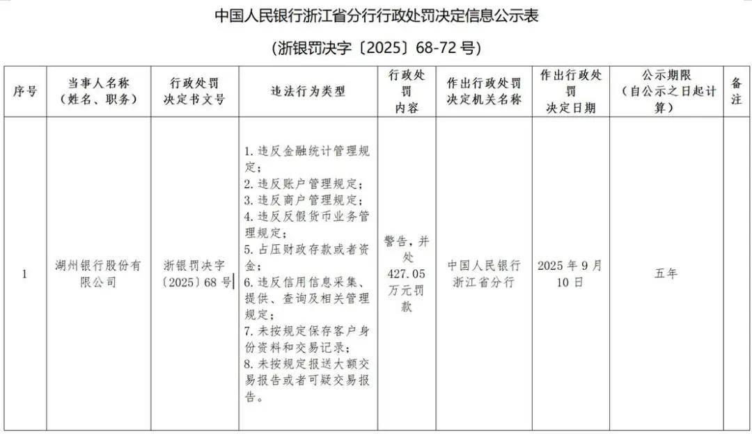 因涉及违反金融统计管理规定等8项违法行为,湖州银行日前被中国人民银行浙江省分行重罚427.05万元,引发关注。据界面新闻等媒体的报道,这不仅是今年以来湖州银行收到的第一张罚单,也是其成立以来收到的最大罚单。