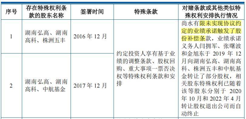 2016年12月增资涉及的特殊股东权利及其终止,因尚水有限未能完成《A轮增资补充协议》中约定的业绩承诺条款,触发了《A轮增资补充协议》中约定的股份补偿条款。2019年12月9日,股份补偿义务人金旭东、闫拥军、张曙波按照《A轮增资补充协议》的约定,与湖南弘高、湖南高科、株洲五丰签署了《股权转让协议书》,金旭东、闫拥军、张曙波合计向湖南弘高、湖南高科、株洲五丰无偿转让了2.08%的尚水有限股权。