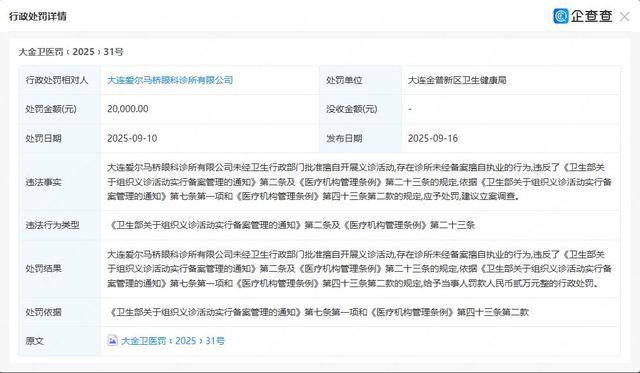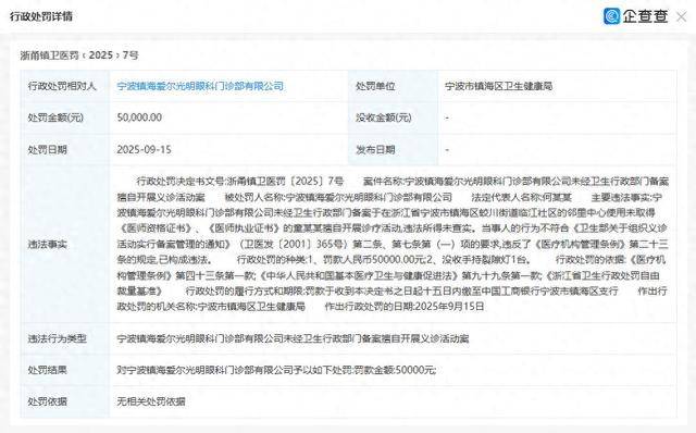 企查查APP显示,近日,浙江宁波镇海爱尔光明眼科门诊部有限公司未经卫生行政部门备案擅自开展义诊活动,被行政处罚;大连爱尔马桥眼科诊所有限公司未经卫生行政部门批准擅自开展义诊活动,存在诊所未经备案擅自执业的行为,被行政处罚。