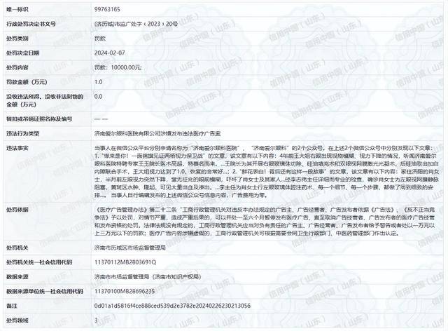 2024年2月,行政处罚决定书文号为济市中卫医罚﹝2024﹞第1号的处罚信息显示,济南爱尔眼科医院有限公司未进行备案擅自在市中区开展义诊活动,依据《中华人民共和国基本医疗卫生与健康促进法》第九十九条第一款,济南市市中区卫生健康局对其罚款5万元。