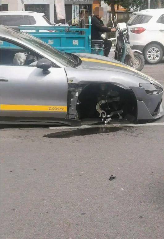 视频中,一辆蓝灰色小米SU7 Ultra停在道路中间,右前方没有轮毂,车辆右前侧没有明显损伤痕迹,现场不少路人围观。