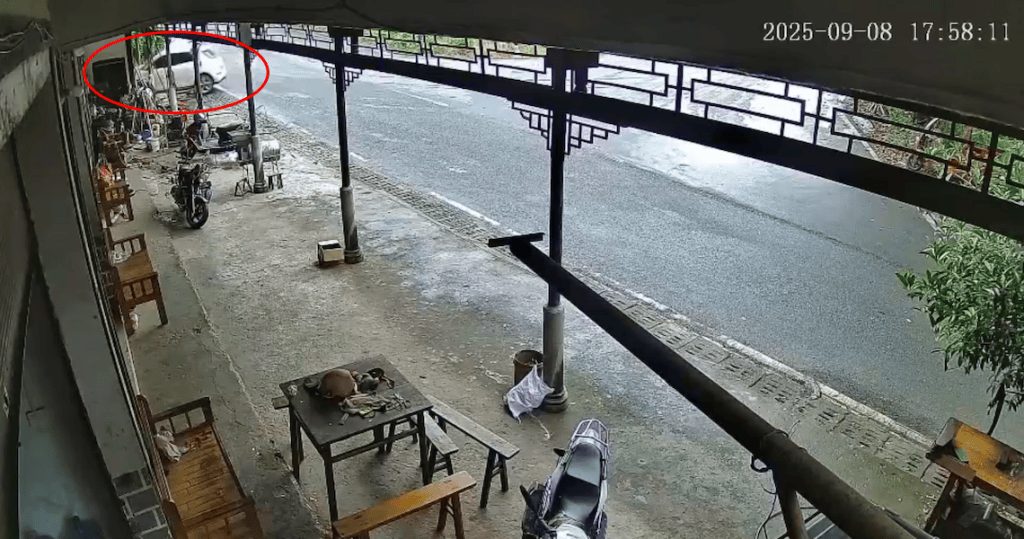 事故现场的一处监控记录下了事发时的情况:一辆轿车从位于监控画面右上方的马路上径直撞上路边民房,疑似伴有刹车时轮胎与地面的摩擦声。随后,周边居民被巨大的撞击声吸引过来围观。