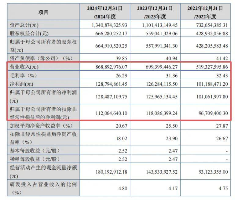 表面上看,隆源股份业绩保持稳定增长。2022年至2024年,公司营业收入分别为5.19亿元、6.99亿元和8.69亿元,2023年和2024年同比分别增长34.67%和24.23%。