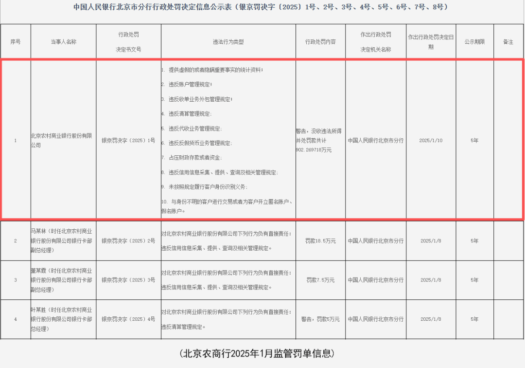 从罚单来看,北京农商行自2025年初以来,先后接到了两次罚单,合计罚款金额达到1087.27万元。