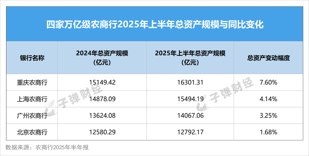 从总资产规模来看,该行是否呈现掉队迹象?截至2025年6月末,四家头部农商行的总资产分别是:重庆农商行1.63万亿、上海农商行1.55万亿、广州农商行1.41万亿、北京农商行1.28万亿。
