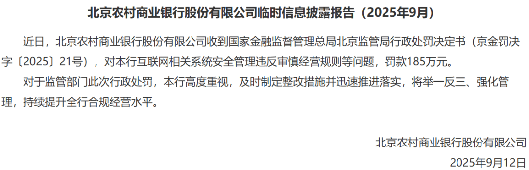 针对本次处罚,北京农商行公开回应称,诚恳接受处罚与监督,并已按监管要求完成整改。下一步,该行将严格落实各项监管要求,强化数据治理与网络安全管理,提升业务管理水平和服务质量。