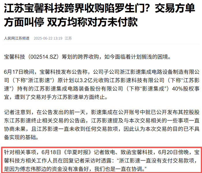 据《华夏时报》报道,6月20日傍晚,宝馨科技工作人员透露:“浙江影速一直没有支付交易款项,是因为傅志伟那边的资金没有准备好,我们也是一直在协调。”