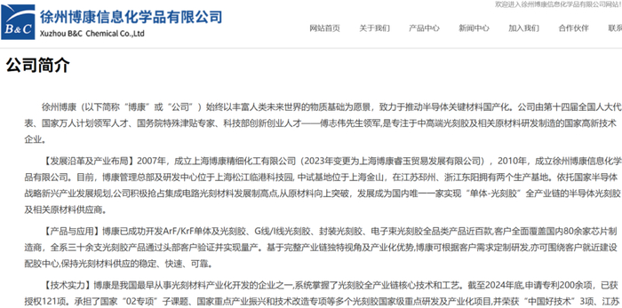 徐州博康成立于2007年,是目前国内唯一一家实现“单体-光刻胶”全产业链的半导体光刻胶及相关原材料供应商,在行业中处于领先地位。