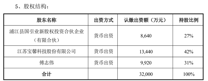 今年1月,宝馨科技与浦江县国引业新股权投资合伙企业(有限合伙)(简称“浦江国投”)、傅志伟成立合资公司浙江影速,注册资本3.2亿元。