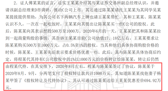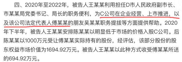 除了收受现金和金条,王巧全还采用了更加资本化的受贿方式——低价入股某家准备上市的公司,其在法院文书中被称为“C公司”。