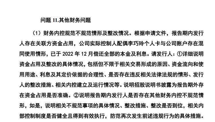 在首轮问询中交易所也对上述资金占用情形给予关注。问询回复显示2020 年,公司存在使用李巧玲个人卡结算公司部分收支业务,个人卡与公司账户混同使用的情况。截至 2020 年末,李巧玲个人卡共代收废料销售款 646.87万元,其中 245.01 万元已用于支付公司业务费用,剩余 401.86 万元未及时转入公司对公银行账户,导致形成了资金占用。相关资金不存在流向发行人客户、供应商的情况或其他异常情形。