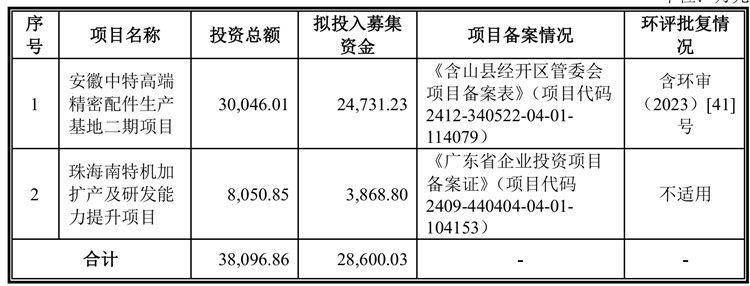 此次,南特科技拟募集资金约2.86亿元用于安徽中特高端精密配件生产基地二期项目、珠海南特机加扩产及研发能力提升项目。