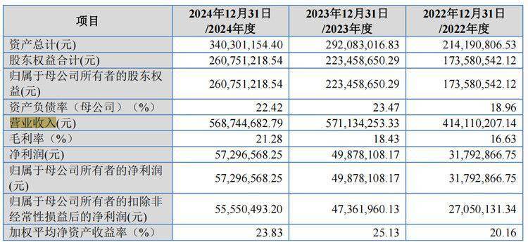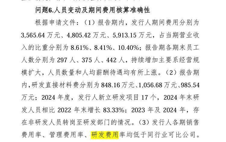 招股书显示,2022年至2024年,该公司研发费用分别为1456.36万元、1848.65万元和2419.99万元,占营收比例分别为3.52%、3.24%和 4.25%。可比公司的研发费用率平均值为6.38%、6.95%、6.63%。