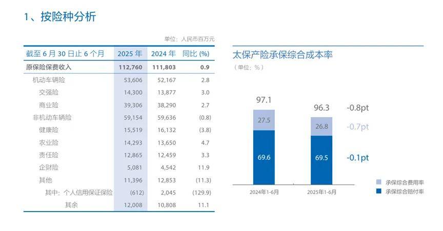 8月29日,太平洋保险(集团)公布的半年报显示,上半年太平洋财险实现原保险保费收入1127.60亿元,同比增长0.9%;保险服务收入968.31亿元,同比增长4.0%;实现承保利润35.50亿元,同比增长30.9%。承保综合成本率96.3%,同比下降0.8个百分点;其中承保综合赔付率69.5%,同比下降0.1个百分点;承保综合费用率26.8%,同比下降0.7个百分点。