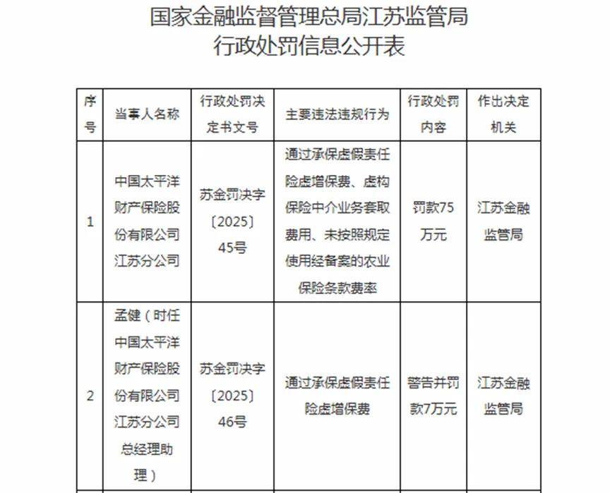 2025年8月,太平洋财险江苏分公司因“通过承保虚假责任险虚增保费、虚构保险中介业务套取费用、未按照规定使用经备案的农业保险条款费率”被罚款75万元。7月11日,太平洋财险因“未按照规定使用经批准或备案的保险条款、费率,投保信息管理不规范,报送的报告、数据不准确等”被国家金融监督管理总局作出行政处罚,监管部门对太平洋财险作出警告并罚款472万元,对安徽分公司罚款30万元、对河南分公司罚款50万元;对叶明满等16名责任人员警告并罚款共计99万元,合计被罚金额达651万元。