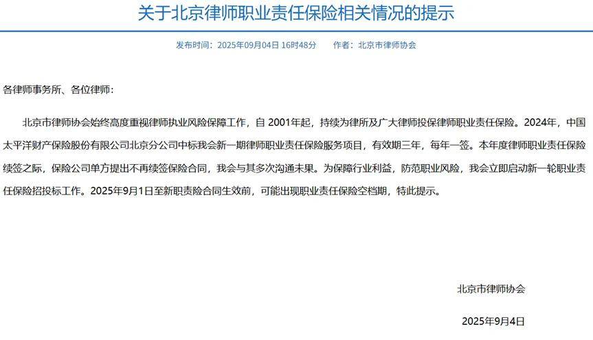 9月4日,一则有关北京律师职业责任保险“断保”的消息引发了业界关注。2024年9月,太平洋财险北京分公司成功中标北京市律师协会的职业责任险项目,合同有期限三年,每年一签。仅仅执行一年后,在2025年续签的节点,太平洋财险却单方面宣布退出。据北京市律协披露,双方历经多次深入沟通,均未能达成共识。