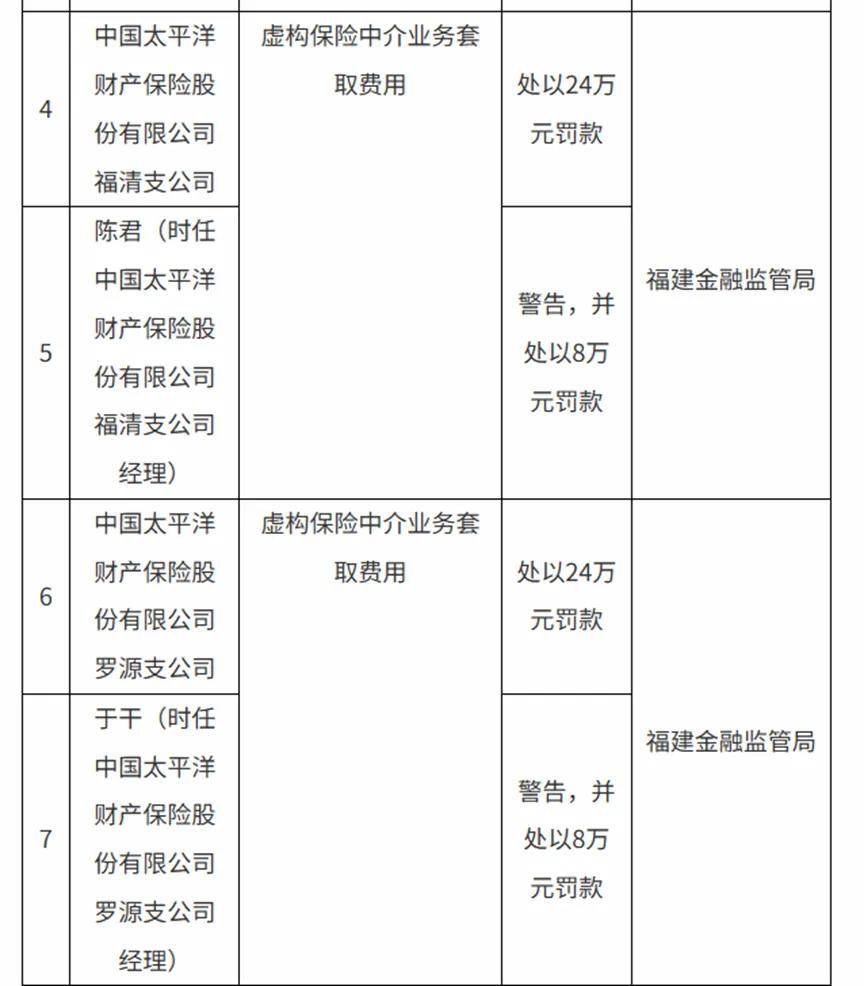 根据福建金融监管局披露的处罚信息显示,太平洋财险福州中心支公司因“财务数据不真实”被处以40万元罚款,时任该公司总经理蔡敏被警告并处罚款8万元;福建自贸试验区平潭片区中心支公司因“跨区域经营雇主责任险”被处以1万元罚款;福清支公司与罗源支公司均因“虚构保险中介业务套取费用”分别被处以24万元罚款,时任两家支公司经理的陈君和于干均被警告并分别罚款8万元。仅在福建地区,太平洋财险相关分支机构及相关责任人累计处罚金额已超过100万元,违规行为涉及财务真实性、业务经营范围、费用管理等核心经营环节,暴露出公司在合规管理与内部控制方面存在多处薄弱环节。