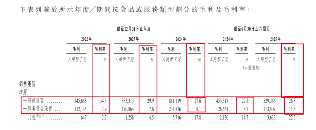 而经典黄金珠宝的毛利率本就不高。在2022年至2024年,其经典黄金珠宝的毛利率一直保持在10%以内。2025年上半年,经典黄金珠宝的毛利率略有升高,但也只有11.8%。
