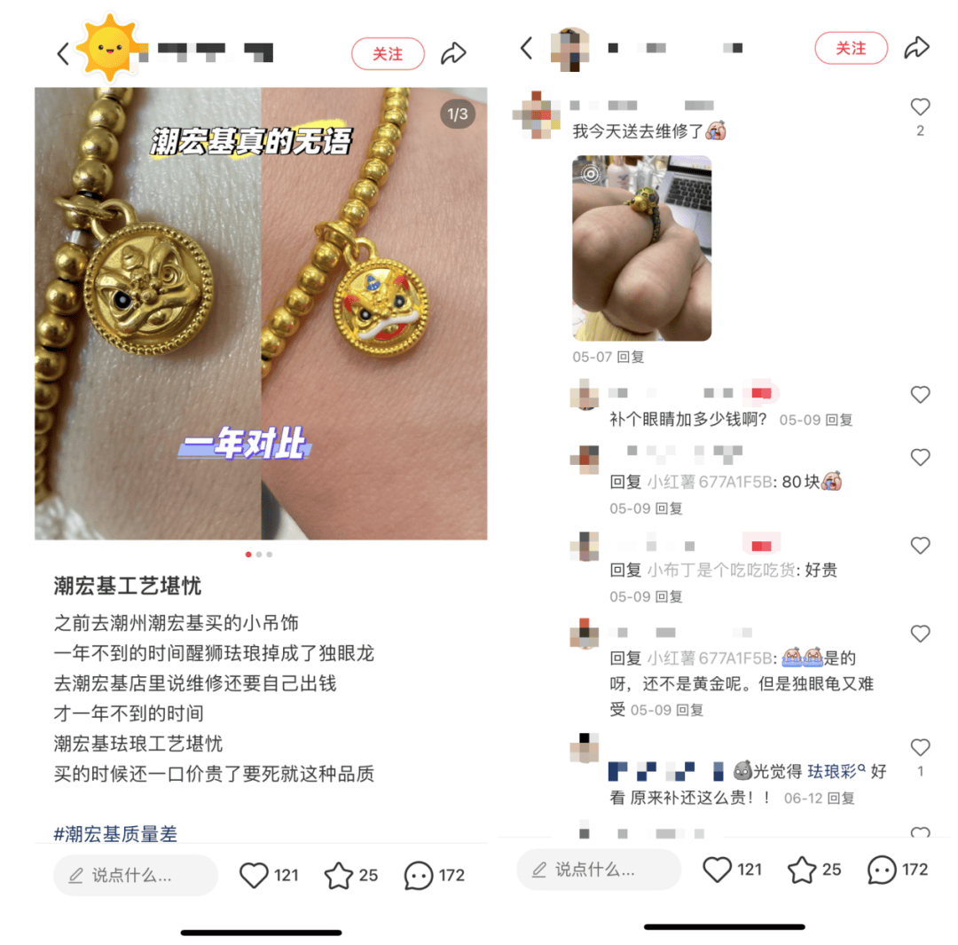 不过,「创业最前线」在小红书注意到,不少消费者吐槽潮宏基添加了珐琅的饰品“工艺堪忧”:“一年不到的时间醒狮珐琅掉成了独眼龙”。还有消费者贴出的图片显示,小乌龟掉了一只珐琅眼睛,表示已经“送去维修了”。