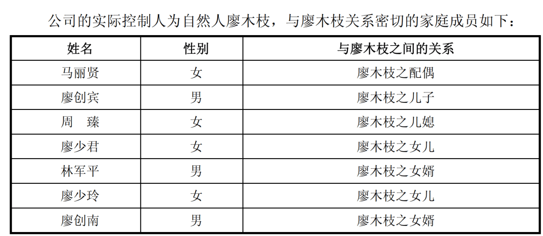 公开资料显示,廖木枝有一子两女,儿子是廖创宾,两个女儿分别为廖少君、廖少玲。但除了儿子廖创宾、女婿林军平在公司身居要职之外,廖木枝另一位女儿廖少玲、女婿廖创南,并没有出现在公司的招股书上。
