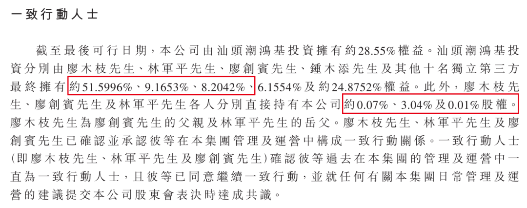 此外,廖木枝三人控股的汕头潮鸿基投资持有公司28.55%股权。其中,廖木枝、廖创宾、林军平合计持有汕头潮鸿基投资68.97%股权,穿透之后,廖木枝家族间接持股19.69%。综合计算,廖木枝三人合计持有公司约22.81%股权。