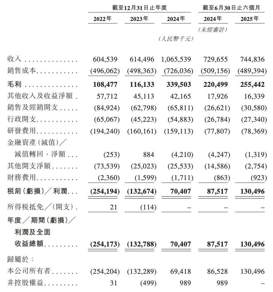 业绩方面,2022年、2023年、2024年度和2025年上半年(下同“报告期”),极飞科技的营收分别约为6.05亿元、6.14亿元、10.66亿元和7.45亿元,净利润分别约为-2.54亿元、-1.33亿元、7040.7万元和1.30亿元。