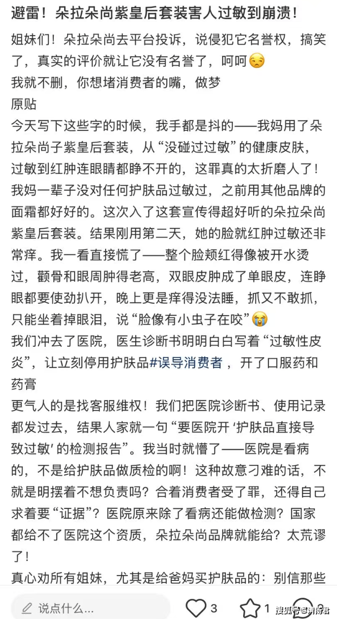 据网友自述:老人此前用其他品牌面霜均无异常,本次使用朵拉朵尚紫皇后套装后次日即出现严重过敏反应——脸颊红肿如开水烫伤,颧骨及眼周明显肿胀致双眼皮变单眼皮,睁眼需用力扒开;夜间瘙痒剧烈无法入睡,因不敢抓挠只能坐着流泪,自述“脸似有虫咬”。