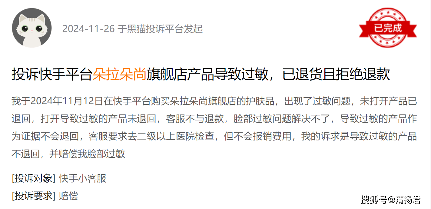 清扬君搜索发现,在黑猫投诉平台,也有多个消费者反映使用朵拉朵尚产品后过敏。