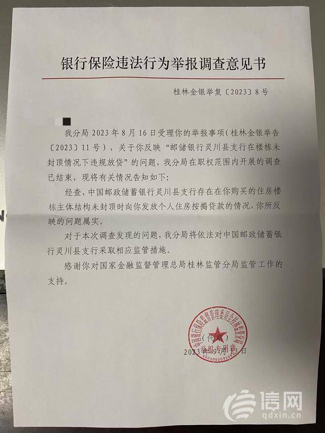 为核实这一情况,在确认相关事实后,李先生于 2023 年向中国银行保险监督管理委员会桂林监管分局提交投诉,同时提供了房屋未封顶的现场实拍图片及银行涉嫌违规操作的投诉举报书。2023 年 8 月,中国银行保险监督管理委员会桂林监管分局向李先生出具调查意见书,明确指出:邮储银行灵川县支行在李先生所购住房楼栋主体结构未封顶时,向其发放个人住房按揭贷款的情况属实,并表示将依法对该银行采取相应监管措施。