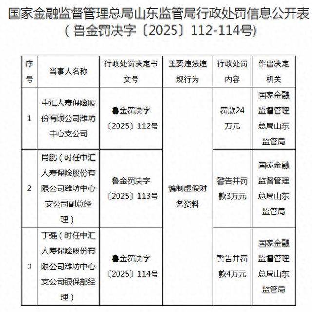 9月26日,山东金融监管局披露的行政处罚信息显示,因编制虚假财务资料,中汇人寿保险股份有限公司潍坊中心支公司被罚款24万元;时任副总经理的肖鹏、银保部经理丁强分别被警告并罚款3万元、4万元。