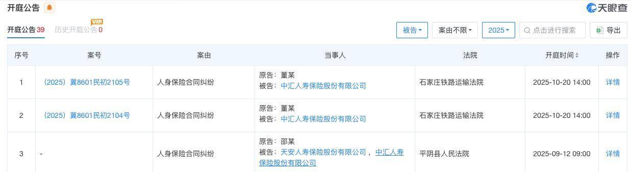 值得一提的是,天眼查诉讼信息显示,2025年以来,中汇人寿以被告身份涉案数量已达39起,数量超过去年33起。案由主要集中在人身保险合同纠纷、人寿保险合同纠纷、保险纠纷、健康保险合同纠纷等,此外还涉及部分劳动合同纠纷及合同纠纷。