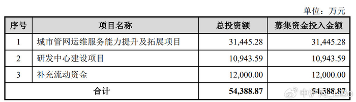 据招股书显示,誉帆科技本次拟募集资金54,388.87万元,募集资金扣除本次发行费用后将分别用于公司城市管网运维服务能力提升及拓展项目、研发中心建设项目、补充流动资金,具体如下: