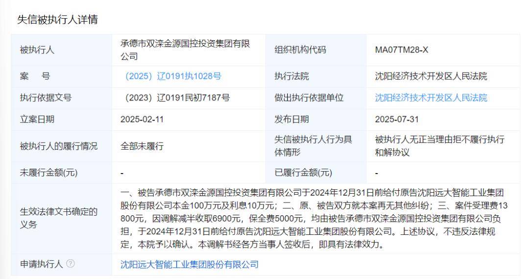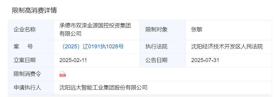 7月31日,金源国控集团被纳入失信被执行人名单,案号(2025)辽0191执1028号,执行法院为沈阳经济技术开发区人民法院。失信被执行人行为具体情形为无正当理由不履行执行和解协议。申请执行人为沈阳远大智能工业集团股份有限公司。同日,金源国控集团及法人张敏被采取限制消费措施,案号(2025)辽0191执1028号。
