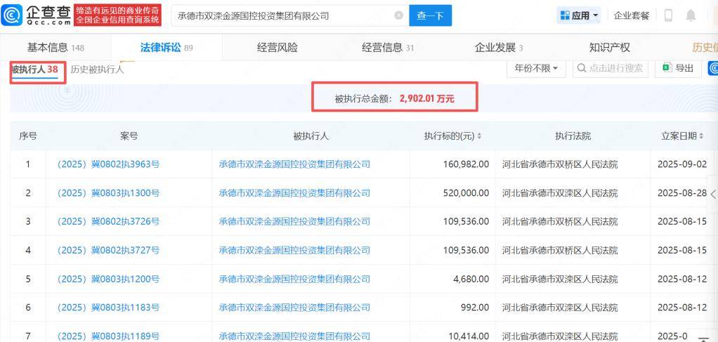 此外,据企查查信息,2025年5月20日至2025年9月2日,金源国控集团被列为“被执行人”38次,被执行总金额2902.01万元。