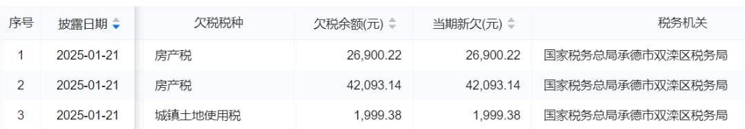 2025年1月21日,国家税务总局承德市双滦区税务局关于2024年四季度欠税的公告,公告附件显示,金源国控集团2024年四季度欠缴房产税两笔,分别为26900.22元、42093.14万元;欠缴城镇土地使用税1999.39元,共计欠税70992.74元。