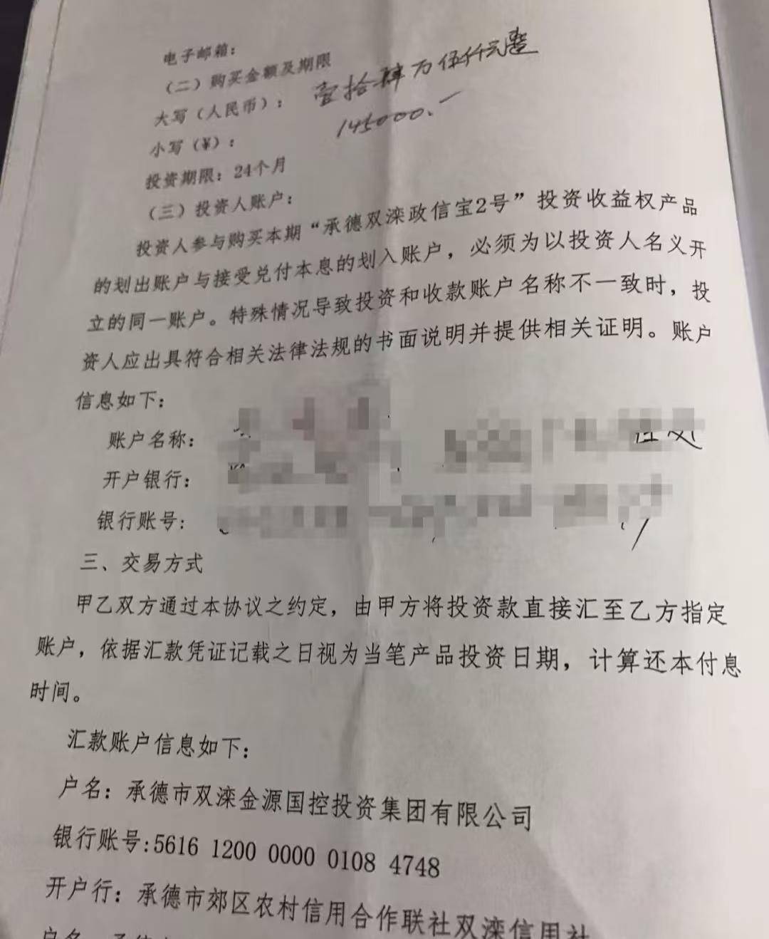 8月22日,河北一网友发布信息称,自己父亲2002年4月12日购买了承德双滦正信保2号投资产品,此款理财产品2024年到期后,本金和利息本应一起返回,但2024年与产品销售人员电话沟通后,对方表示资金需要回笼,本金暂时无法支付,可以按照合同支付利息。2025年3月,利息支付款项也停止了。之后再联系产品销售人员,电话便一直处于无法打通状态。