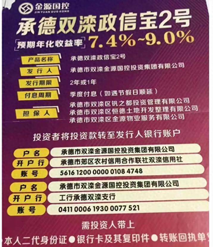 根据网友提供信息,承德双滦正信保2号产品发行人为承德市双滦金源国控投资集团有限公司(以下简称“金源国控集团”),发行期限为1-2年,季度付息,预期年华收益率为7.4%-9.0%,担保人为承德市双滦区钒之都投资管理有限公司、承德市双滦区恒德土地开发整理有限公司、承德市双滦区金源物业服务有限公司。
