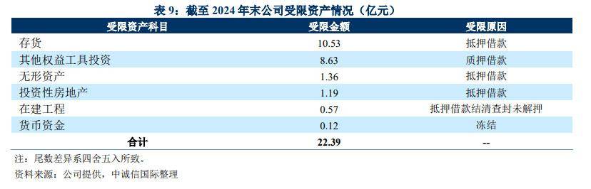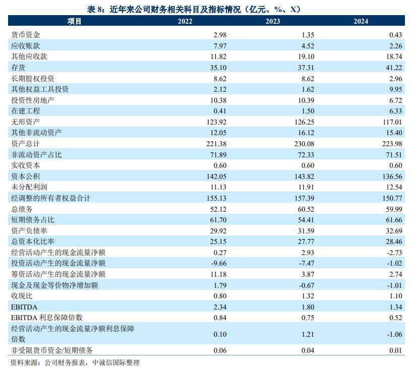 受限情况方面,截至2024年末,登封建投受限资产规模22.39亿元,主要为用于抵质押借款的存货及其他权益工具投资等。截至2024年末,登封建投公司账面货币资金规模继续下降至0.43亿元,其中0.12亿元受限,货币资金保有量不足。