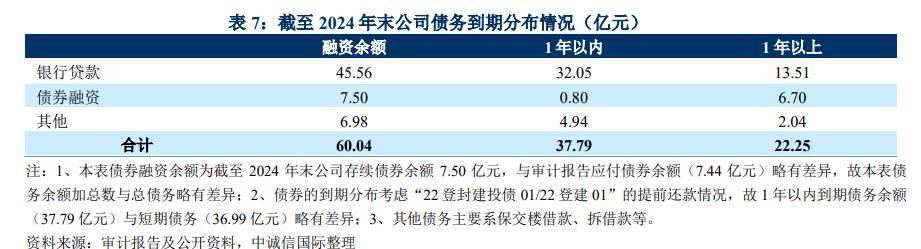 截止2024年末公司债务到期合计60.04亿元,由银行贷款、债券融资和其它债务构成,一年以内到期债务总额为37.79亿元。