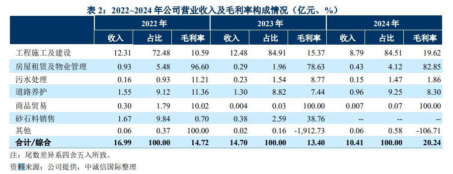 其他业务方面包括污水处理、商品贸易、道路养护、砂石料销售等业务,业务类型较为丰富,对公司营业收入形成重要补充。