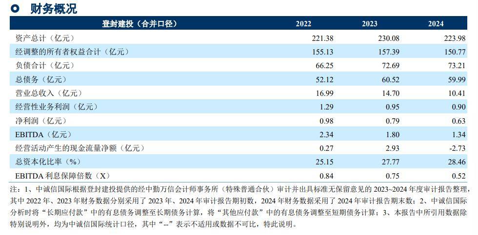 截至2024年期末,登封建投总资产223.98亿元,经调整的所有者权益合计150.77亿元,负债合计73.21亿元,总债务59.99亿元,总营收10.41亿元,净利润0.63亿元,经营活动产生的现金流量净额为-2.73亿元,投资活动产生的现金流量净额为-1.02亿元,筹资活动产生的现金流量净额为2.74亿元,EBITDA利息保障倍数为0.52.