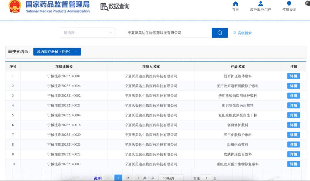 根据国家药品监督管理局信息显示,宁夏沃美达生物医药科技有限公司共有13条注册信息,管理类别均为第二类。