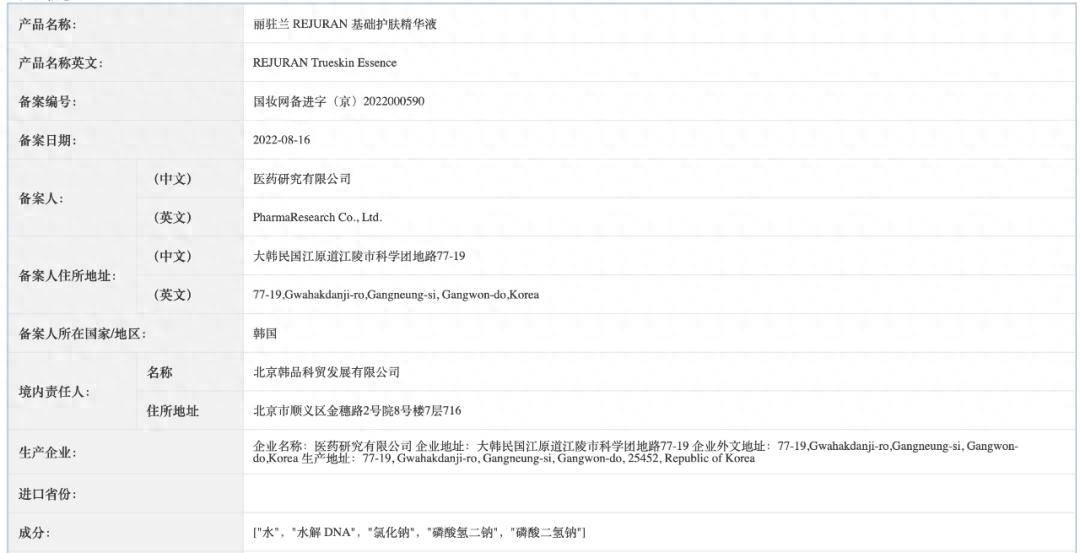 据泊人院线水光-东哥直播间内的产品页面显示,其讲解的产品品牌为丽驻兰REJURAN基础护肤精华液,进口批文编号为国妆网备进字(京)2022000590,产品规格为2ml*2支/盒,产地是韩国,券后价为1488元。根据国家药品监督管理局进口普通化妆品备案信息,丽驻兰REJURAN基础护肤精华液的境内责任人是北京韩品科贸发展有限公司。