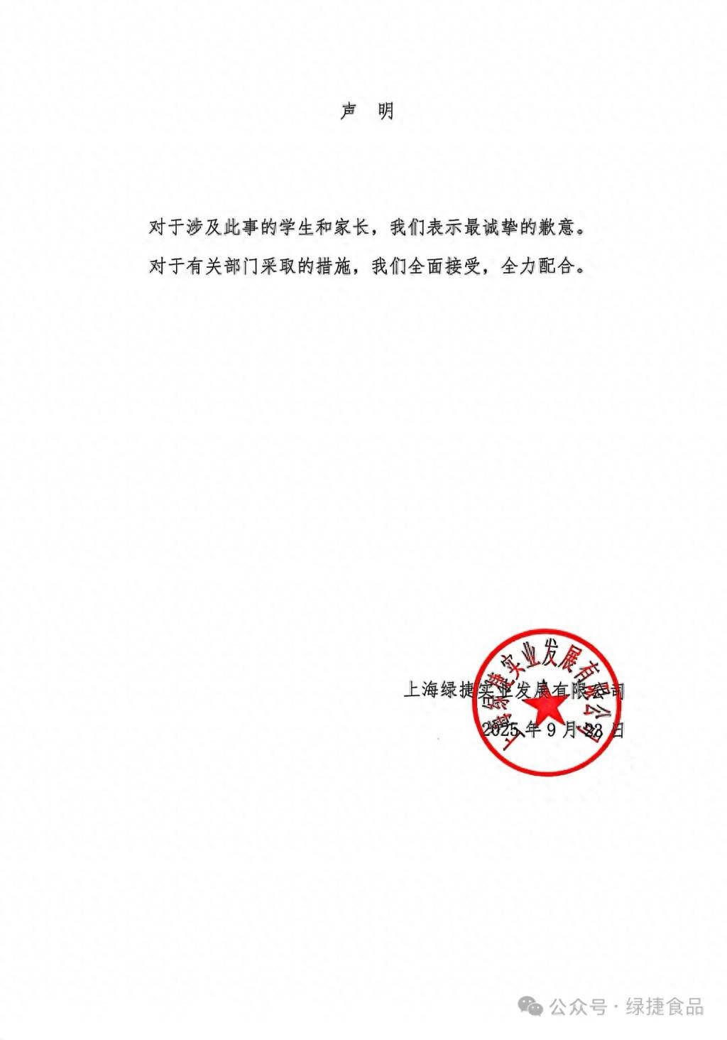 9月23日晚,上海市公安局、市场监管局和教育委员会的联合通报指出,上海绿捷实业发展有限公司(下称“上海绿捷”)涉嫌瞒报食品安全相关信息,公安机关已立案侦查并控制相关人员。