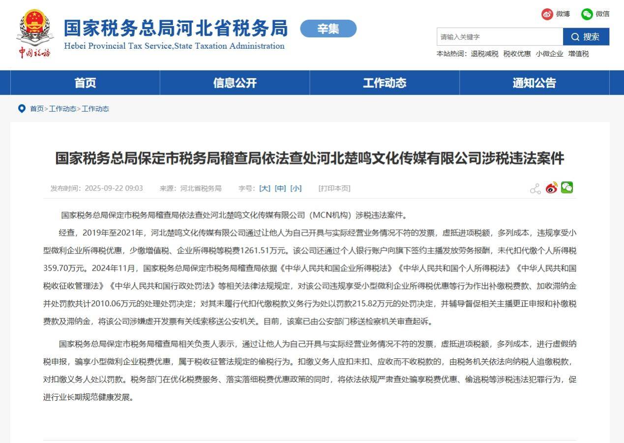 2024年11月,国家税务总局保定市税务局稽查局依据《中华人民共和国企业所得税法》《中华人民共和国个人所得税法》《中华人民共和国税收征收管理法》《中华人民共和国行政处罚法》等相关法律法规规定,对该公司违规享受小型微利企业所得税优惠等行为作出补缴税费款、加收滞纳金并处罚款共计2010.06万元的处理处罚决定;对其未履行代扣代缴税款义务行为处以罚款215.82万元的处罚决定,并辅导督促相关主播更正申报和补缴税费款及滞纳金,将该公司涉嫌虚开发票有关线索移送公安机关。