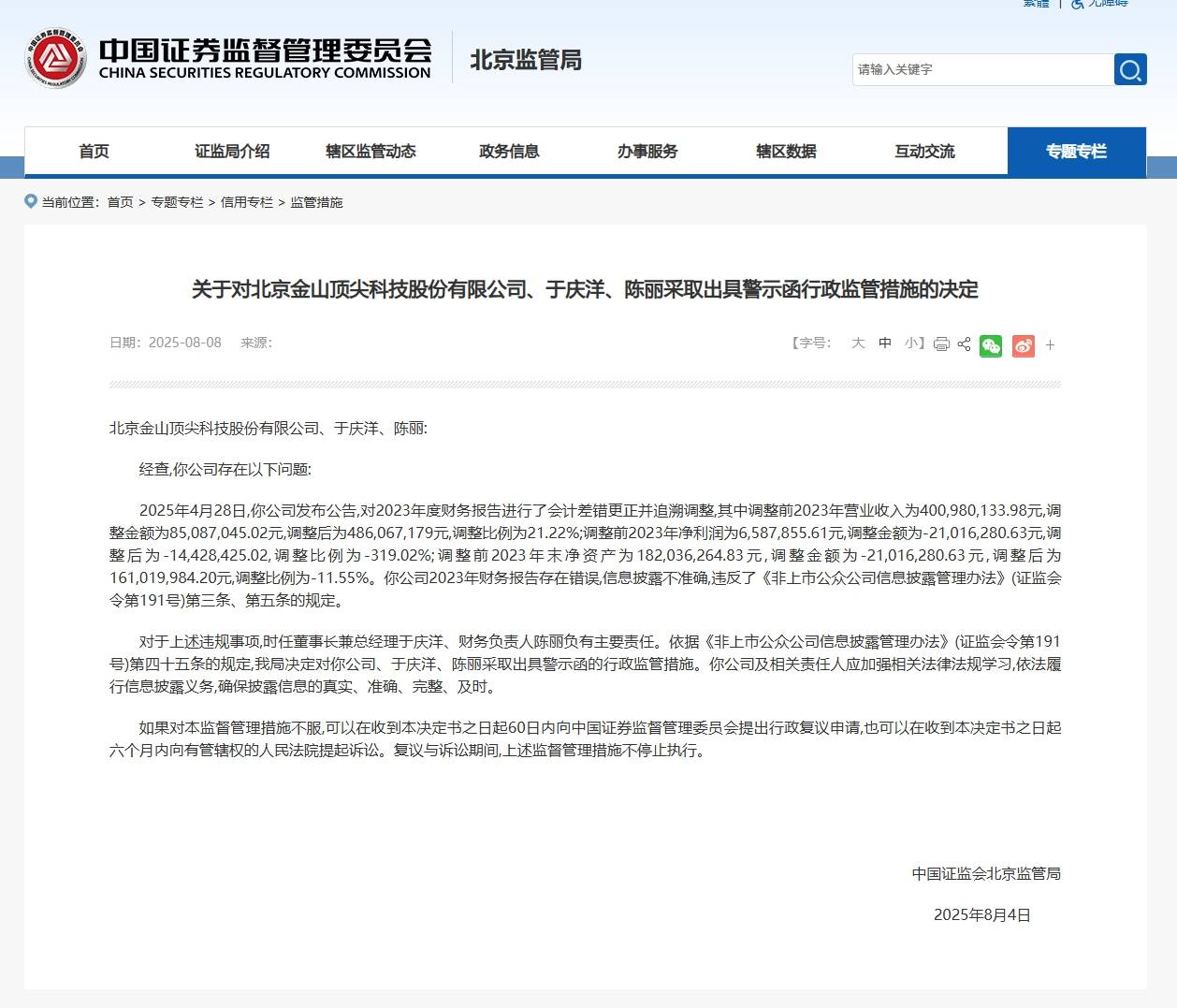 另据公开信息,中国证券监督管理委员会北京监管局已于2025年8月对金山顶尖及相关责任人采取行政监管措施。